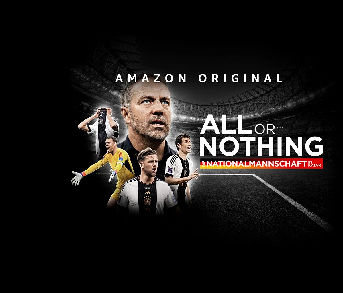 Für die Amazon Original Doku-Serie „All or Nothing: Die Nationalmannschaft in Katar“ realisierten wir im Auftrag von BDA Creative die Retusche und Reinzeichnung des zentralen Kampagnenmotivs. Die Serie begleitet das DFB-Team exklusiv hinter den Kulissen der umstrittenen Weltmeisterschaft in Katar und zeigt einen schonungslosen Blick auf Emotionen, Druck und Dynamik innerhalb der Mannschaft.